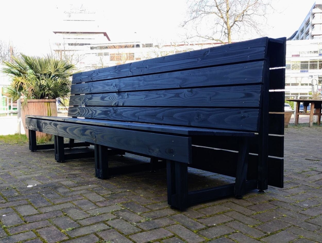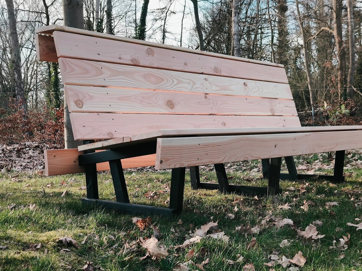 Onze houten banken zijn gemaakt van massief geschaafd Douglas, met een FSC keurmerk. Alle banken zijn van eigen ontwerp en worden gemaakt in eigen werkplaats. De onderstellen zijn watervast verlijmd en geschroefd. Alle verbindingen zijn geschroefd met roestvrij staal. De banken staan op kunststof stelpoten. Zodoende staan de banken nooit met de "voeten" in het water. Douglas heeft de eigenschap om na verloop van tijd te verharden en vergrijzen. De levensduur van onbehandeld Douglas ligt rond de 15 jaar. Een bank kan dus het hele jaar buiten blijven staan en krijgt zo z'n eigen kleur en uitstraling.